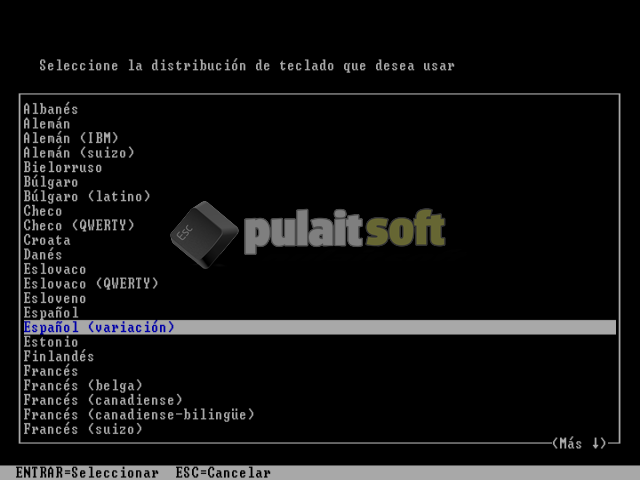 6. En la pantalla nos aparece que seleccionemos el idioma del teclado (elegimos Español) y, volvemos a pulsar Intro para seleccionar el idioma y pasar a la pantalla siguiente.